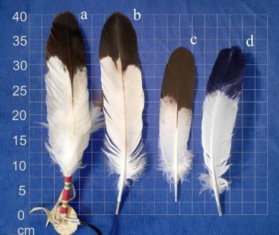 Fig. 3 : Reproduction d’une plume caudale immature d’aigle royal (utilisée comme modèle) à l’aide de plusieurs teintures capillaires appliquées sur de grandes plumes commerciales blanches.