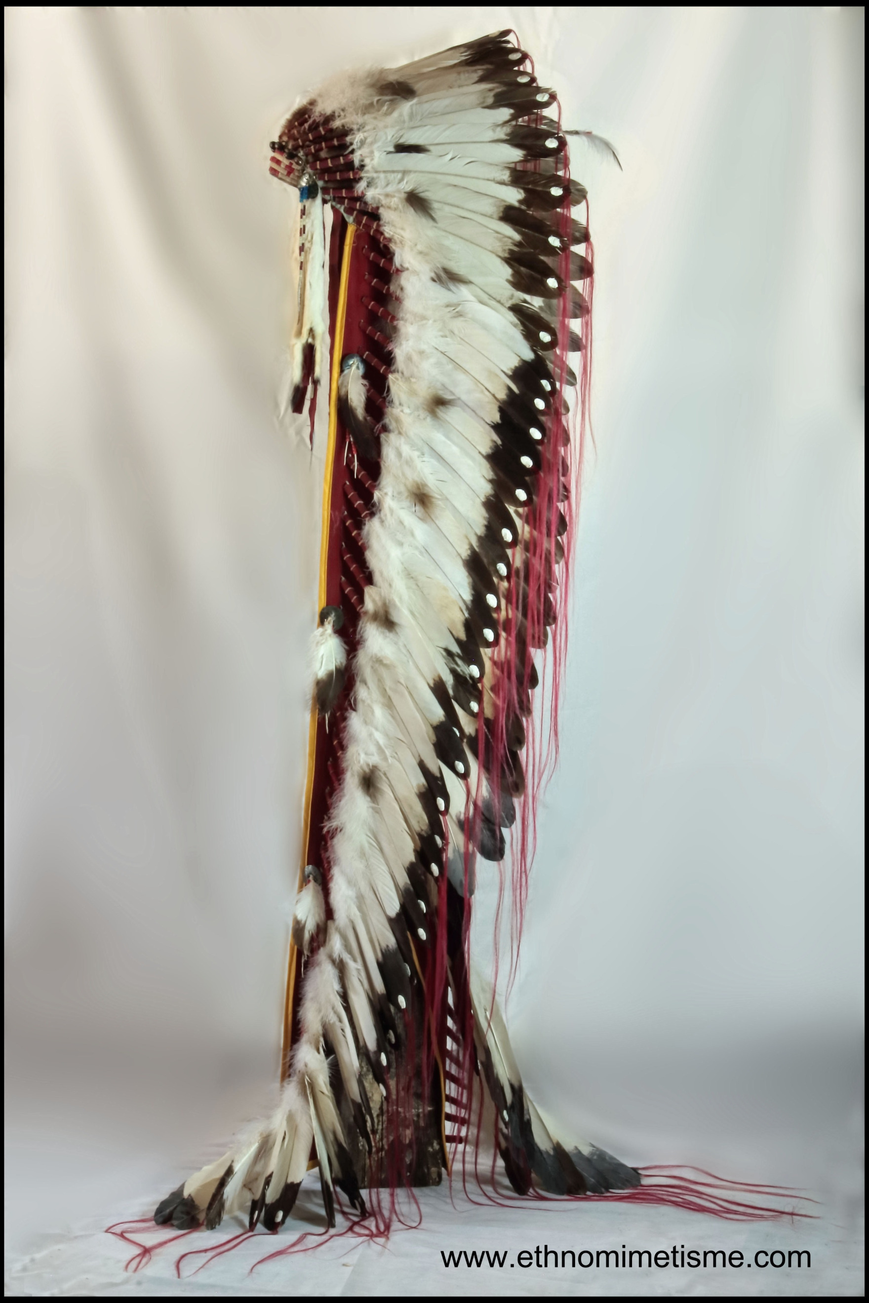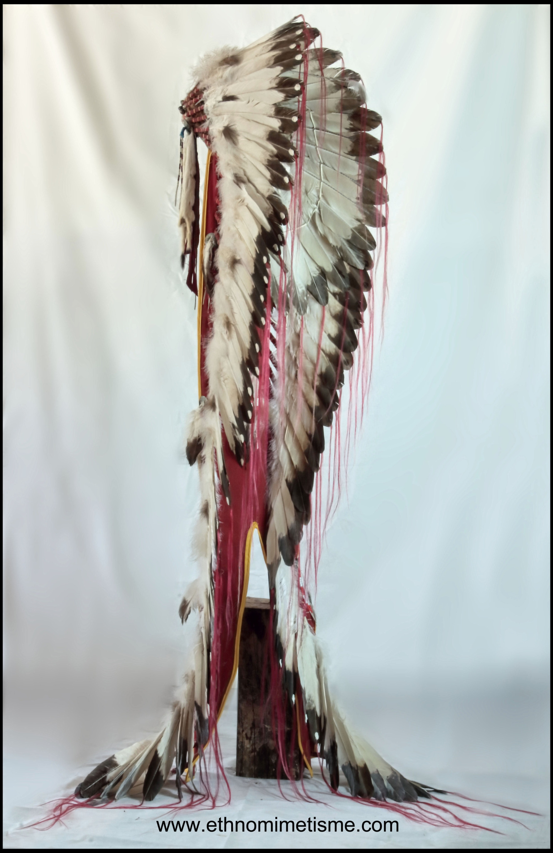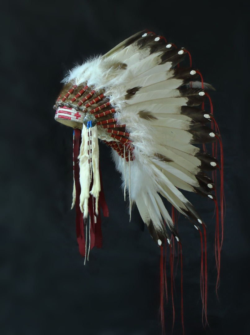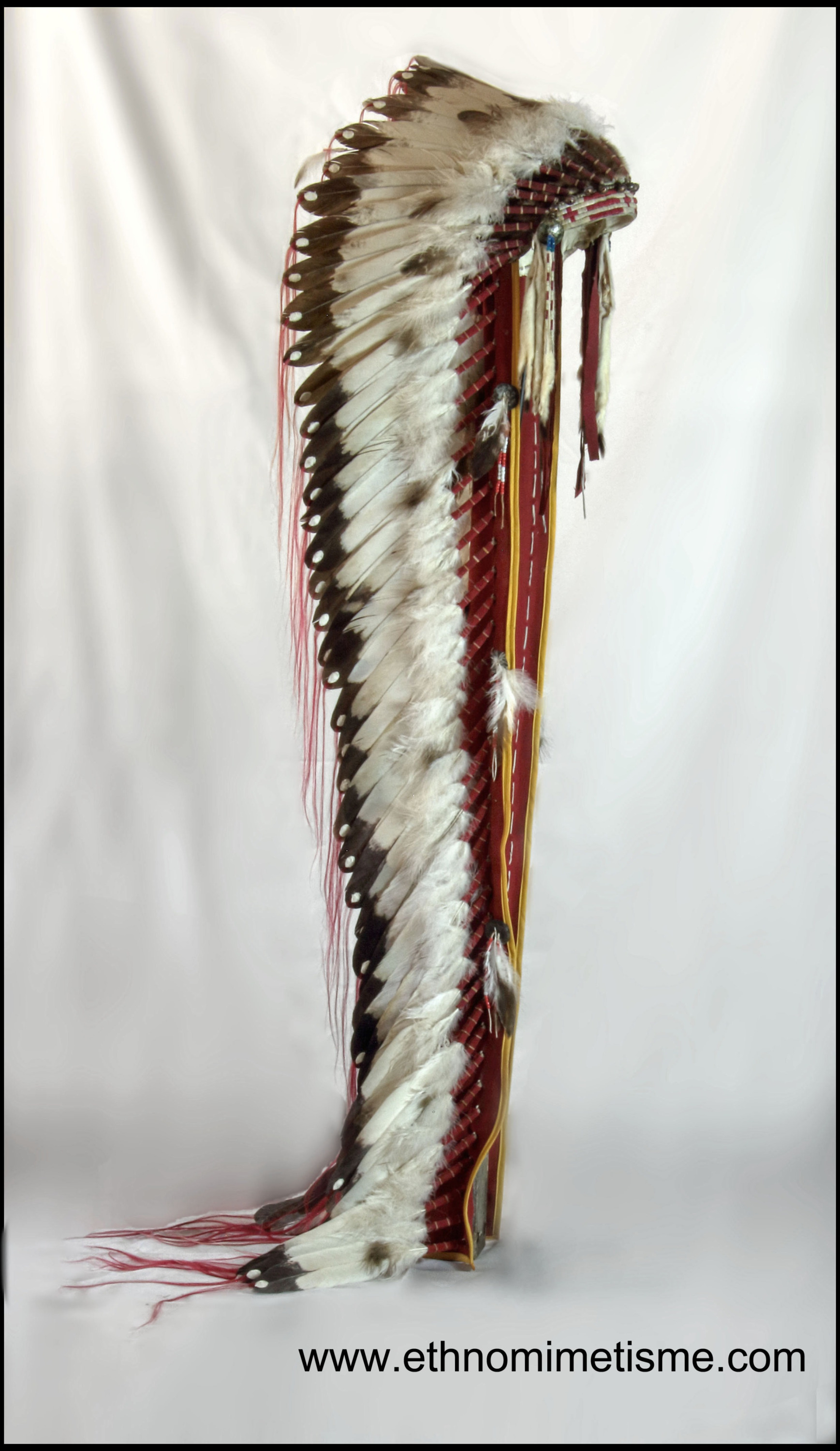 Le bonnet de guerre traditionnel est historiquement confectionné à partir des plumes caudales immatures de l’aigle royal (Aquila chrysaetos), investies d’une haute valeur symbolique et spirituelle dans les cultures des peuples autochtones des Plaines. Bien que cette espèce ne soit plus considérée comme menacée, sa protection demeure assurée par la Convention de Washington (CITES), qui encadre strictement le commerce international des espèces sauvages. Aux États-Unis, la détention de plumes d’aigle royal est strictement réservée aux citoyens amérindiens reconnus au niveau fédéral et détenteurs des autorisations délivrées par les services compétents (U.S. Fish and Wildlife Service).