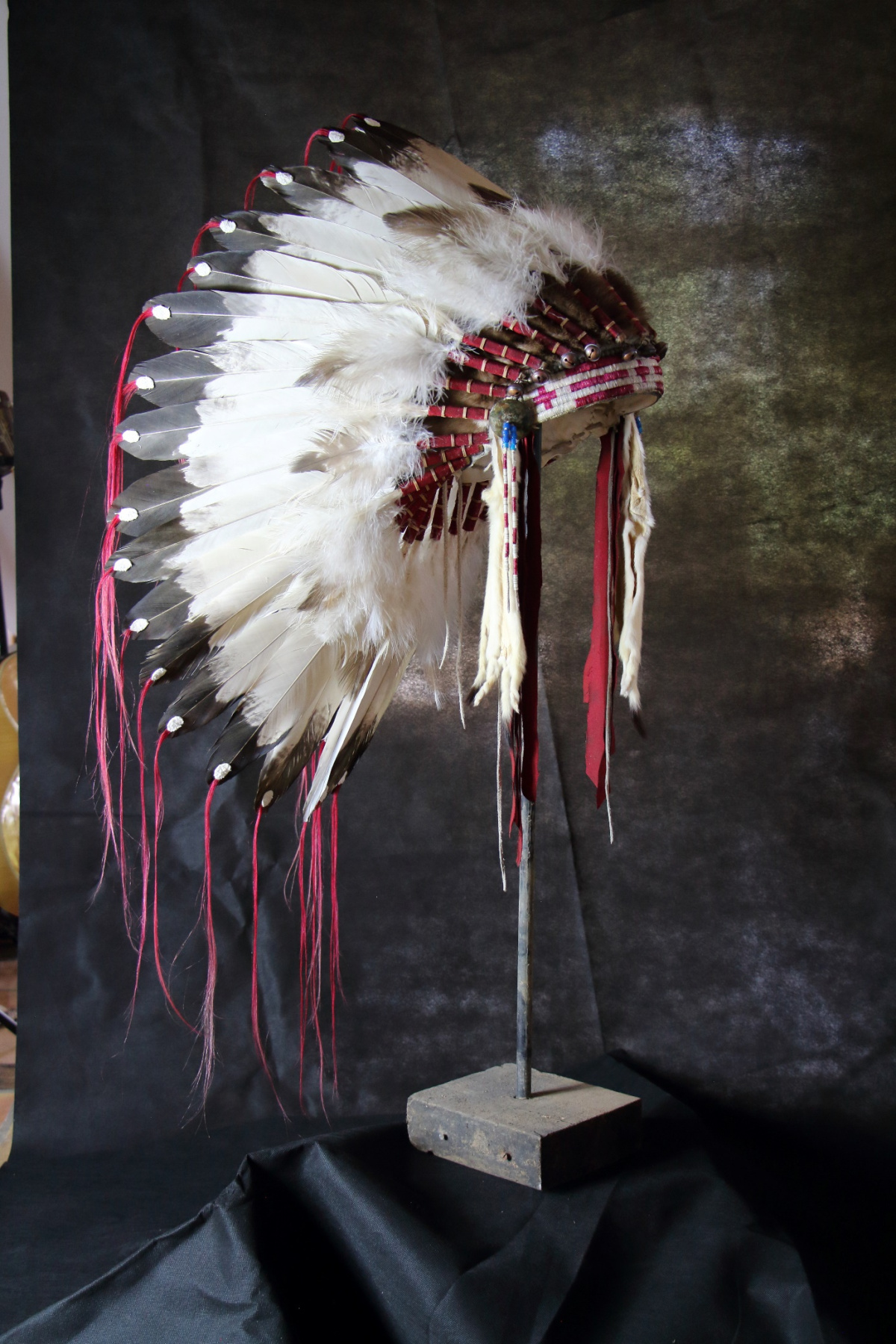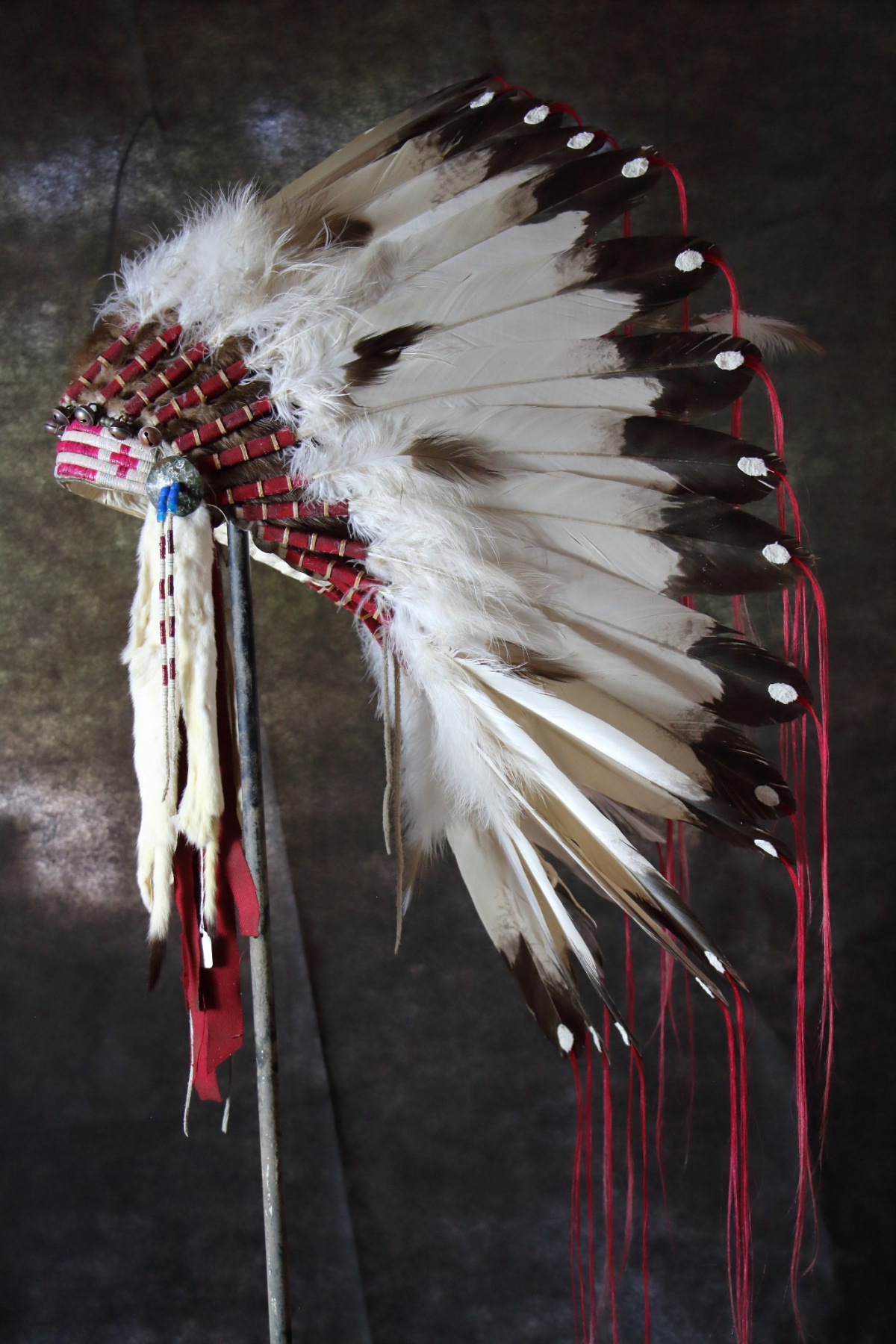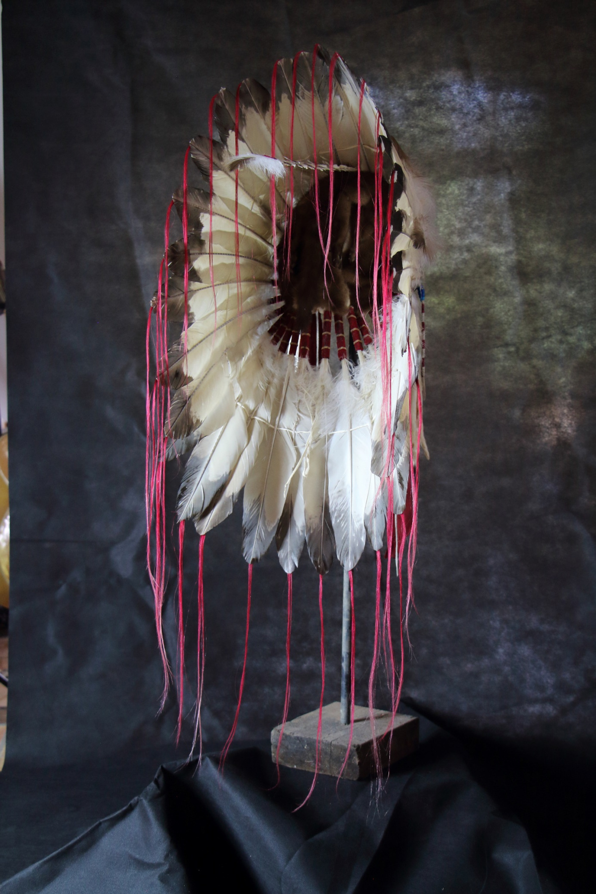 Le bonnet de guerre traditionnel est historiquement confectionné à partir des plumes caudales immatures de l’aigle royal (Aquila chrysaetos), investies d’une haute valeur symbolique et spirituelle dans les cultures des peuples autochtones des Plaines. Bien que cette espèce ne soit plus considérée comme menacée, sa protection demeure assurée par la Convention de Washington (CITES), qui encadre strictement le commerce international des espèces sauvages. Aux États-Unis, la détention de plumes d’aigle royal est strictement réservée aux citoyens amérindiens reconnus au niveau fédéral et détenteurs des autorisations délivrées par les services compétents (U.S. Fish and Wildlife Service).
