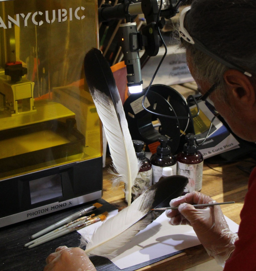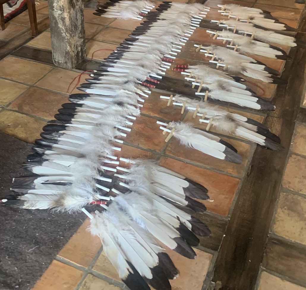 Cette méthode artisanale, combinant agents décolorants et colorants capillaires, permet d’approcher au plus près les caractéristiques visuelles et mécaniques des plumes originales — en particulier leur texture, leur souplesse et la subtilité des motifs. Elle constitue une alternative crédible dans un contexte de restitution patrimoniale ou d’exposition, lorsque l’usage de véritables plumes d’aigle est juridiquement ou éthiquement proscrit.